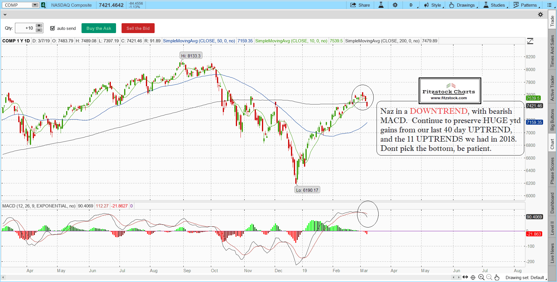 Naz is in a DOWNTREND, with bearish MACD. Continue to preserve ytd gains from our last 40 day uptrend, and the 11 uptrends from 2018. Dont pick the bottom, be patient.