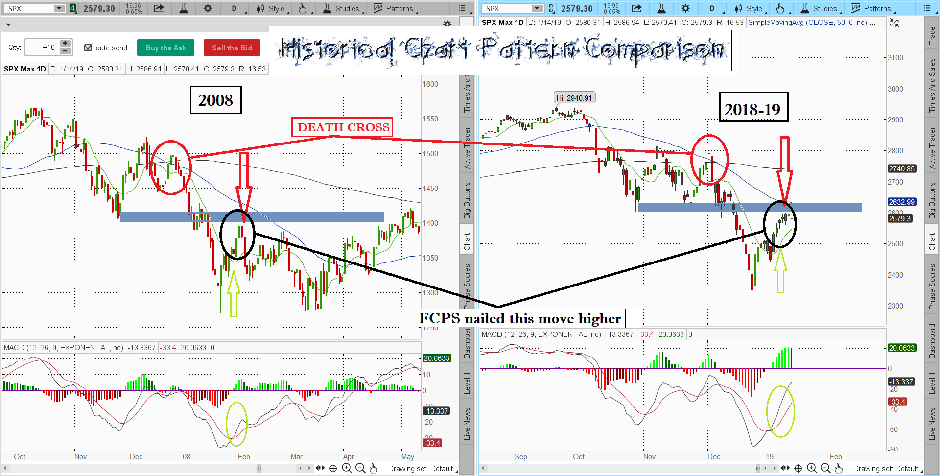 Fitzstock Charts nailed the charts in early 2019 with the 2008 historical chart pattern comparison, which called for a huge rally to test the 50 day simple moving average.   Using this historical chart pattern comparison analog we were able to capitalize on the +10% move off the lows in the stock market, and had 20 different stock option DOUBLE (up over 100%).