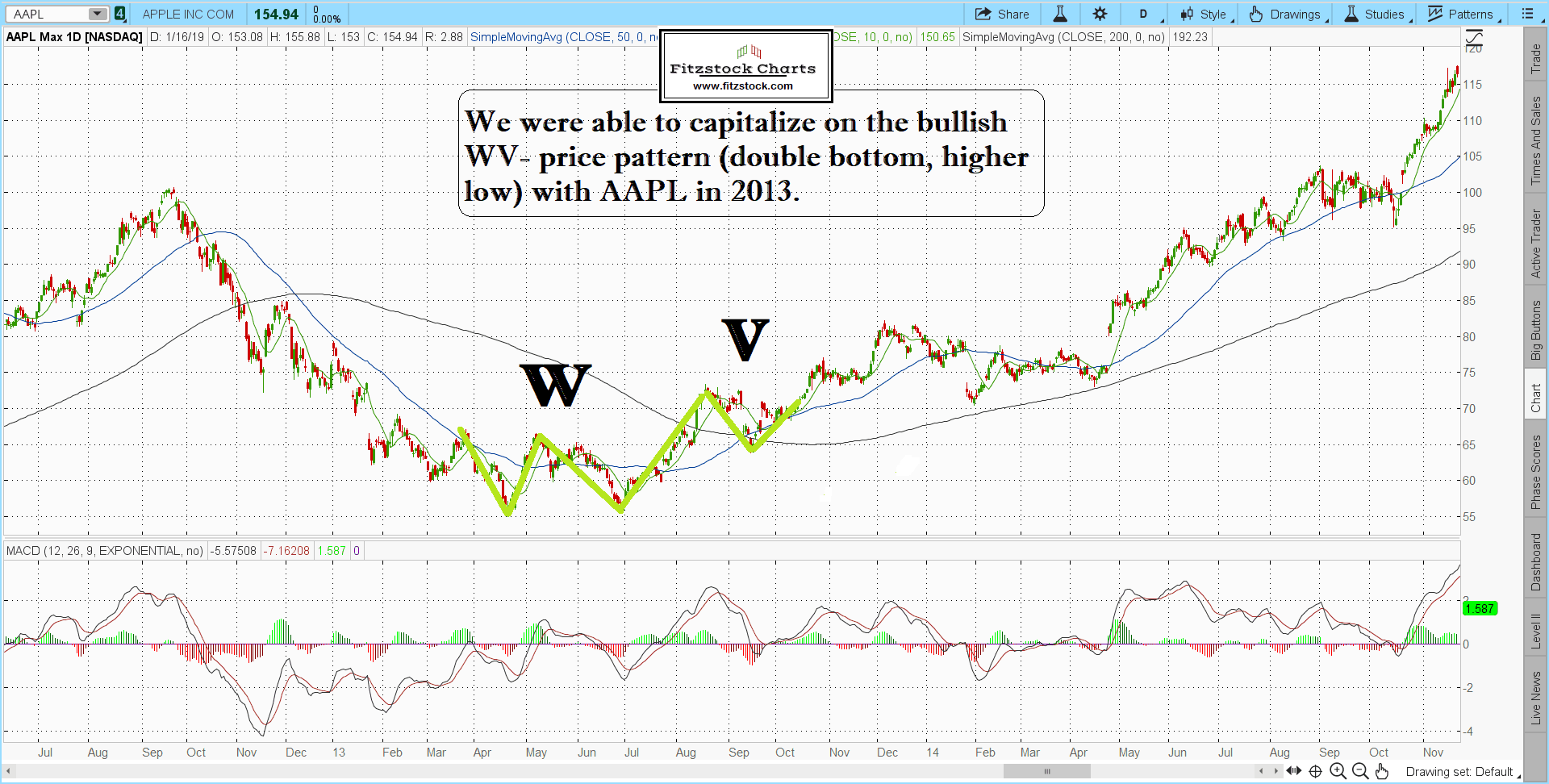 WV bottom (double bottom,  higher low)- we saw this pattern with Apple in 2013 at $60/share, then the stock went up 300%