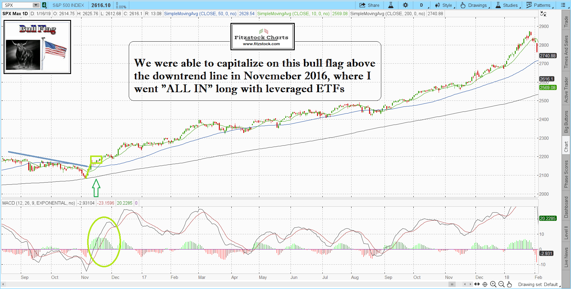 -Bull flag above the downtrend line- we saw this pattern develop 11/2016 where I went “ALL IN” long with leverage  ETFs (SPXL & TQQQ)