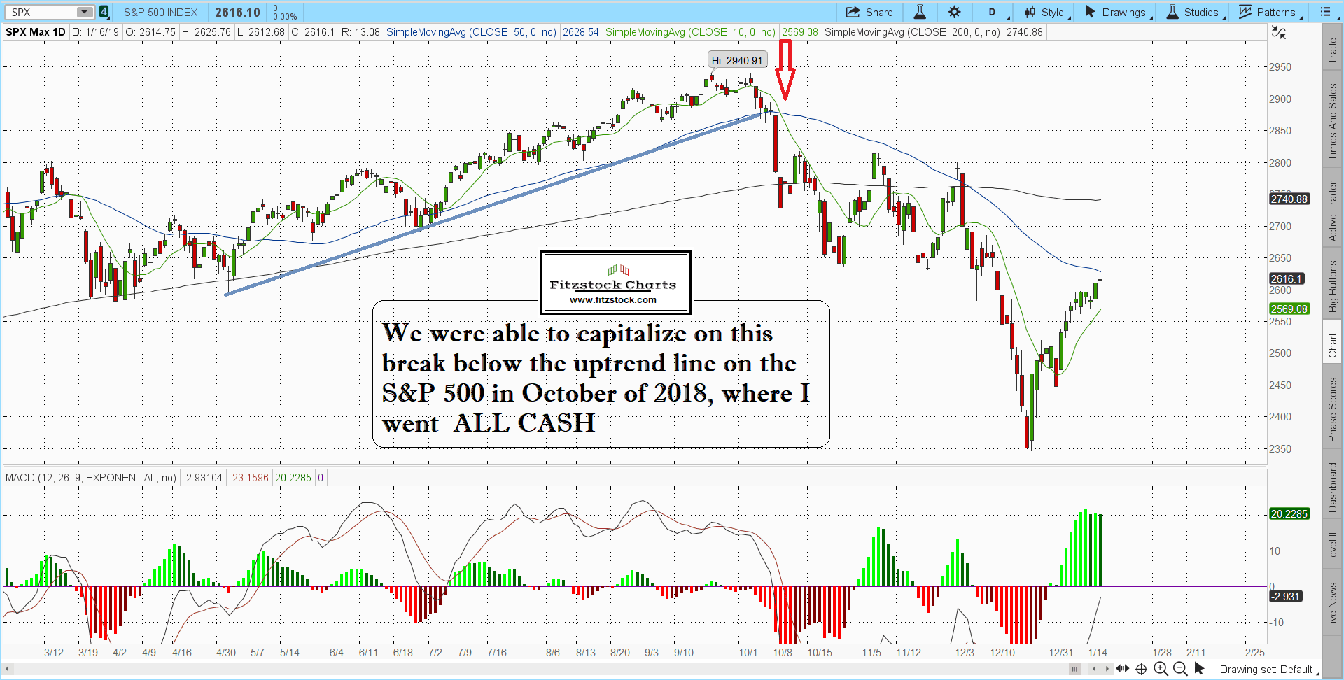-Break below the uptrend line (which we saw in October 2018, when the S&P 500 broke below 2900, giving a strong sell signal, where I went all cash)