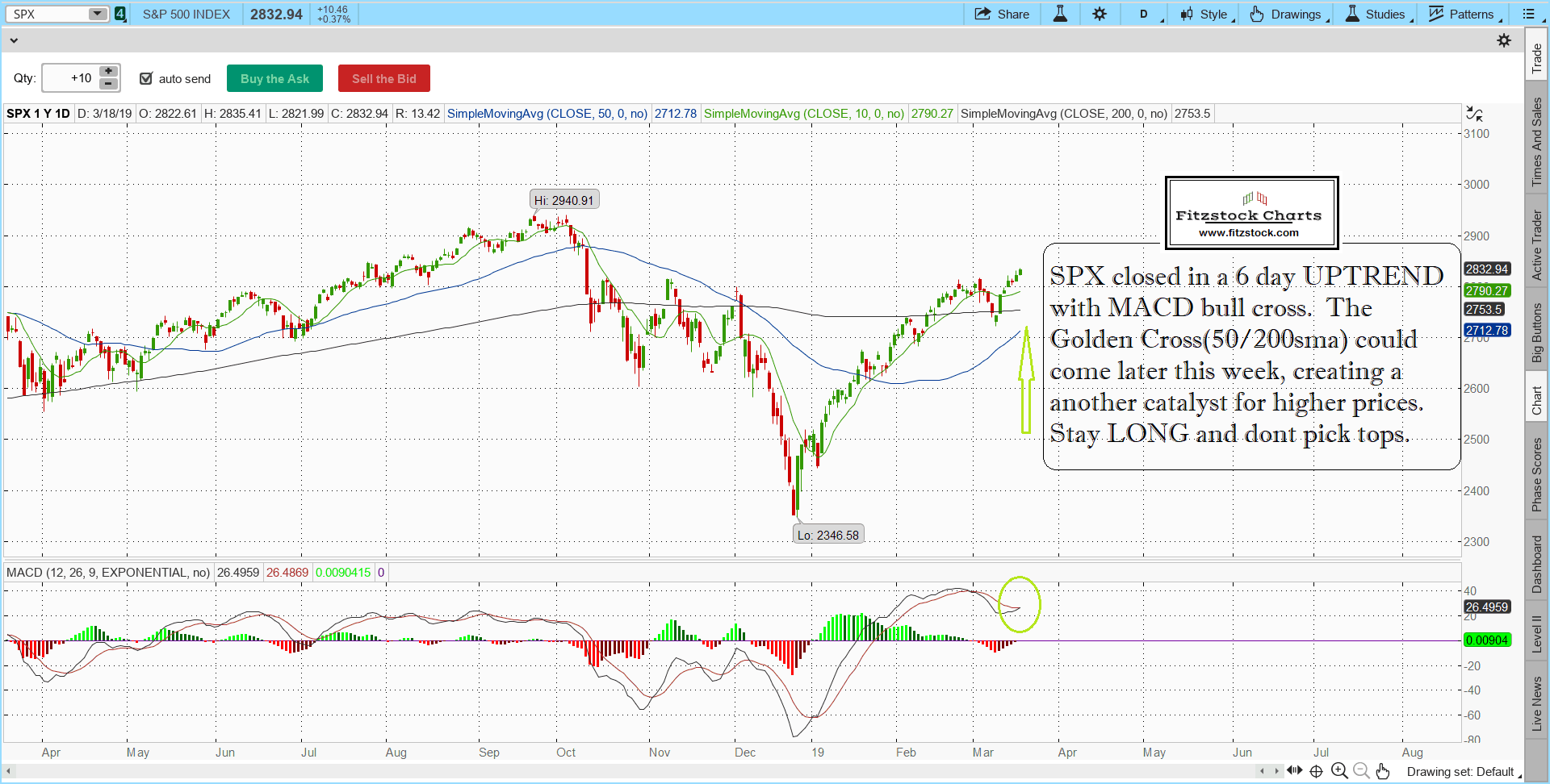 SPX closed in a 6 day UPTREND with MACD bull cross. The Golden Cross (50 thru 200 sma) could come later this week, creating a catalyst for higher prices. Stay LONG and dont pick tops.