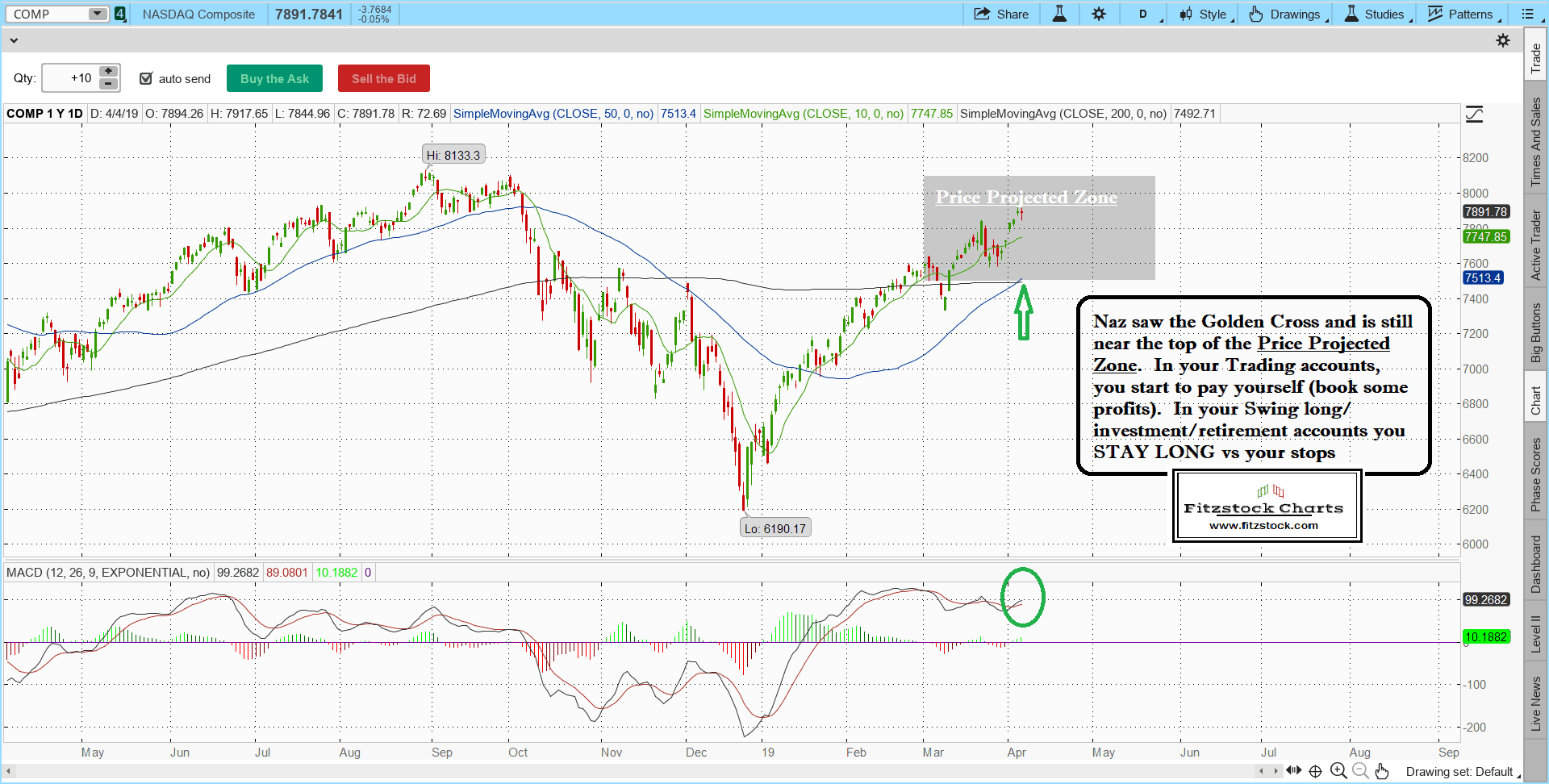 The Naz is near the top of our Price Projected Zone, so you can start to scale profits in Trading accounts. In your Swing accounts, STAY LONG vs your stops.