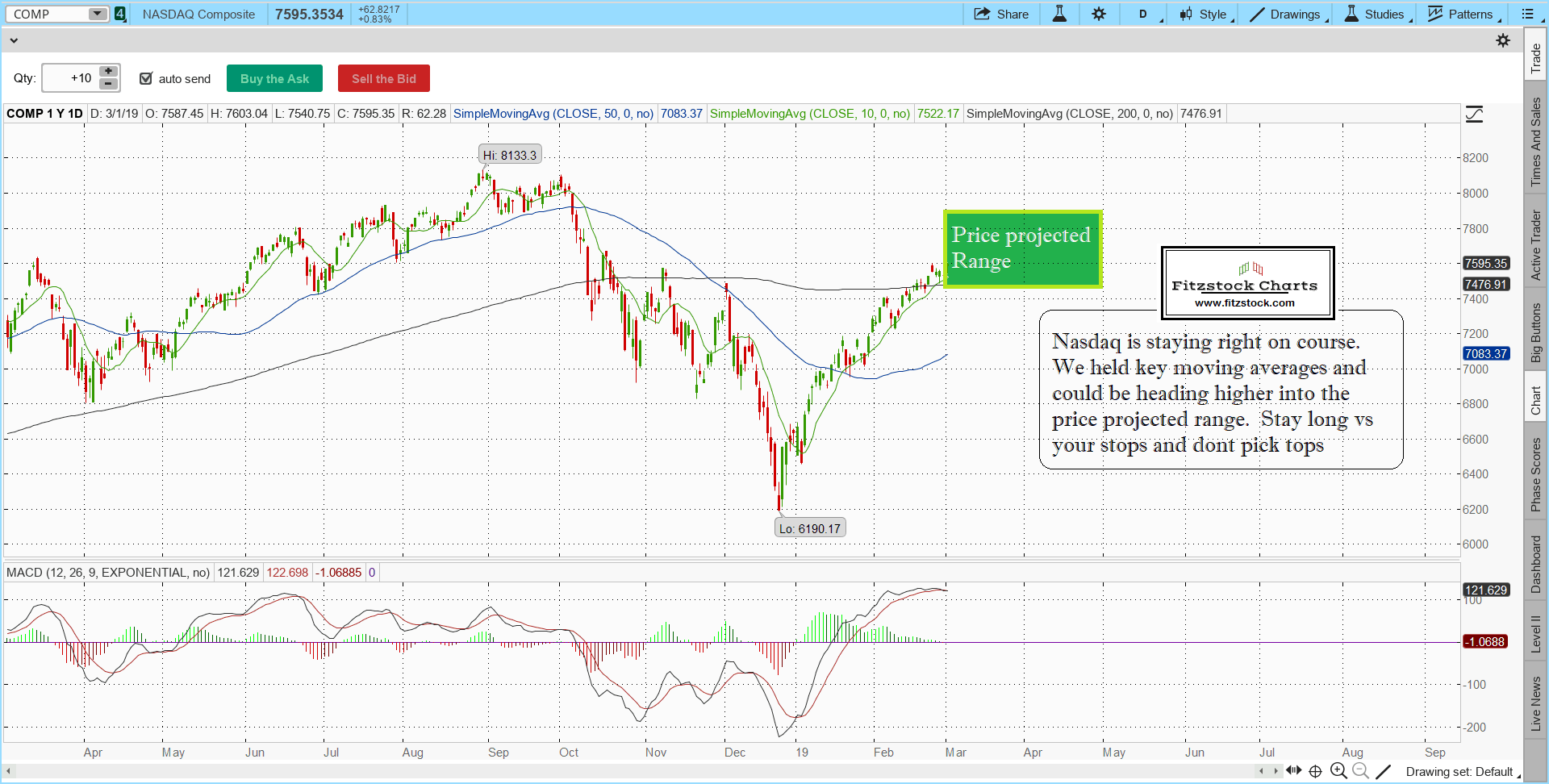 Nasdq is staying right on course. We held key moving averages and could be heading higher into our price projected range. Stay long vs your stops, and dont pick tops.