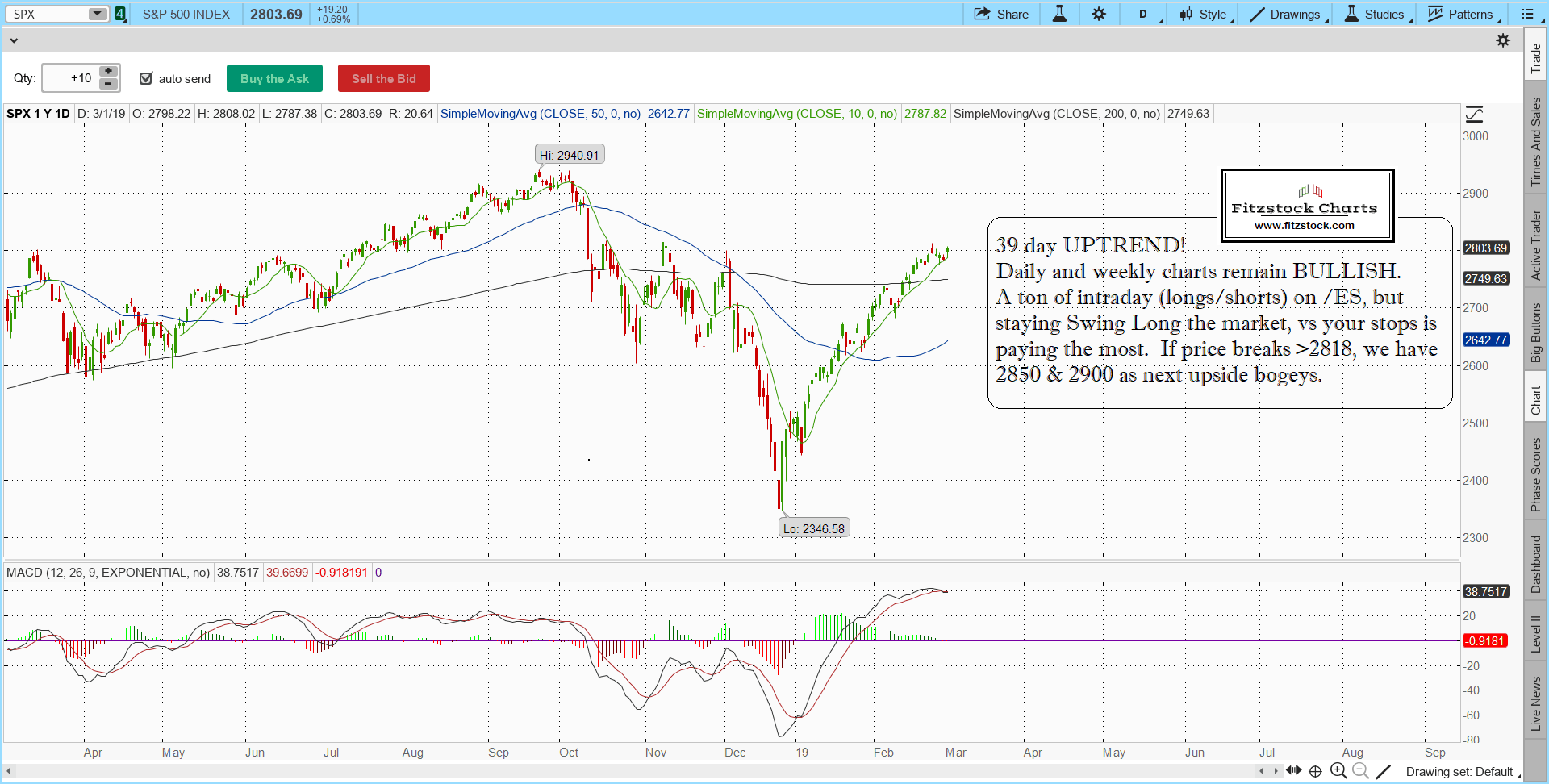 Daily and weekly charts remains bullish. A ton of intraday (both longs and shorts) on /ES, but staying swing long the market vs your stops is paying the most. If price breaks>2818, we have 2850 & 2900 as next upside bogey.