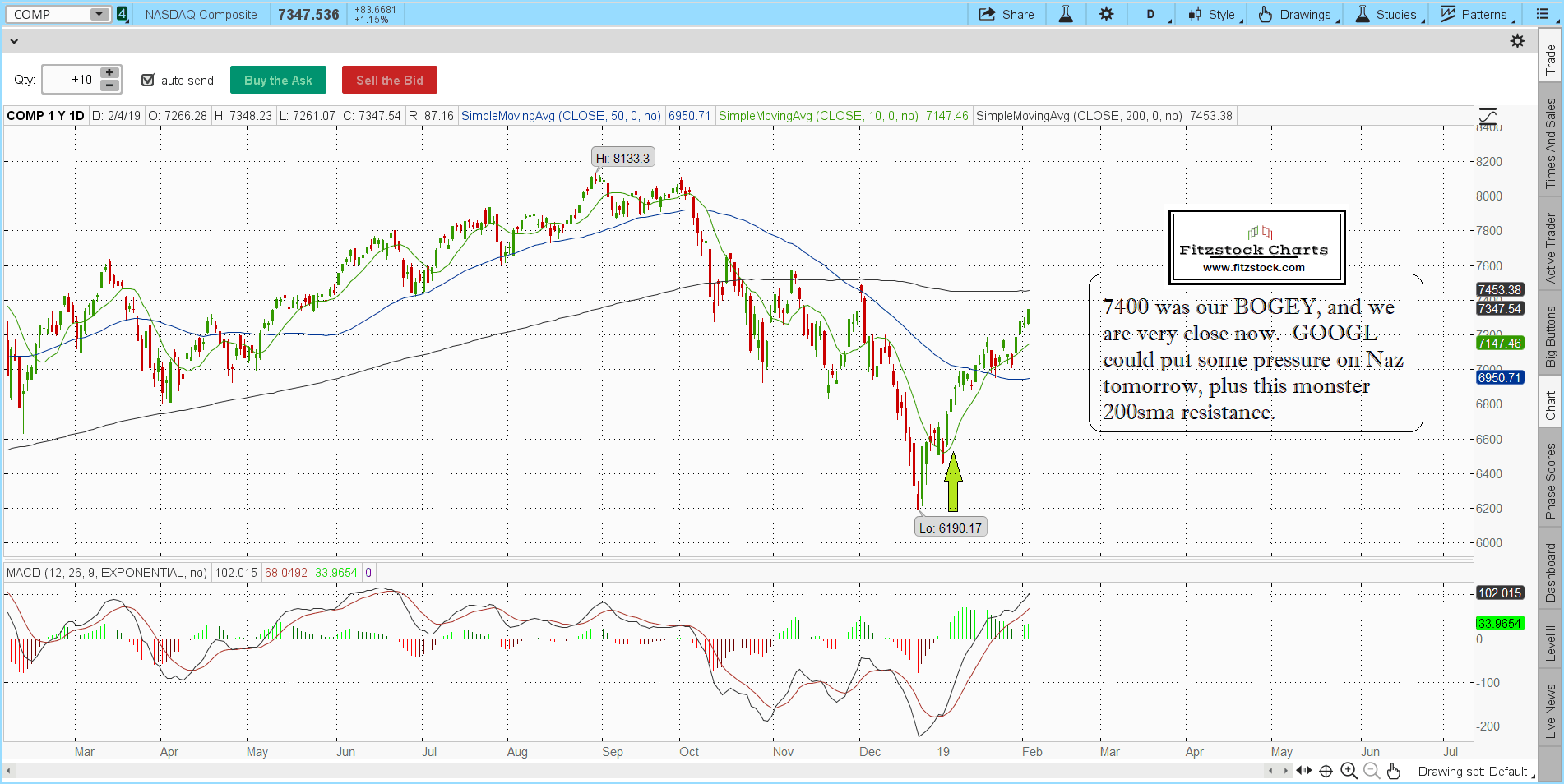 S&P 500 (SPX) and Nasdaq composite daily closing charts with notes -2/4/19-Trading Rules Of Engagement-Stock Trading Strategies-Stock Options Strategies