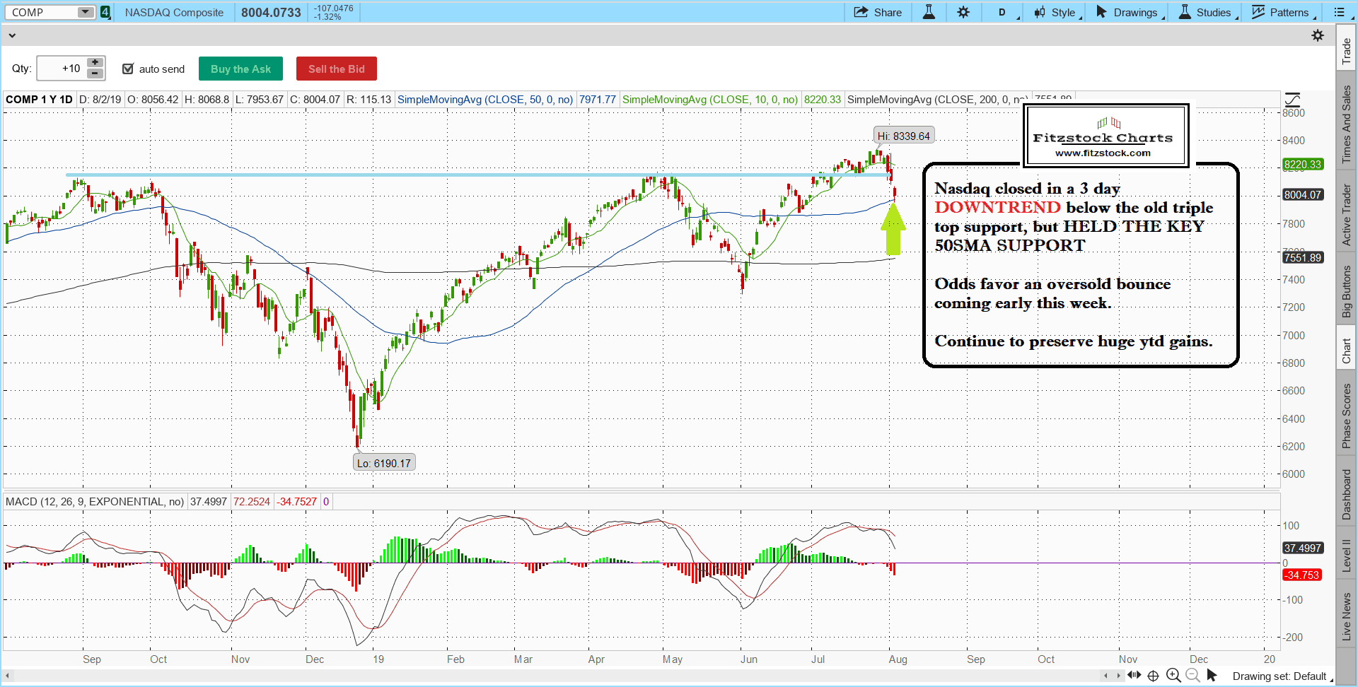 The Nasdaq closed in a 3 day downtrend below the old triple top support, but above our key 50sma
