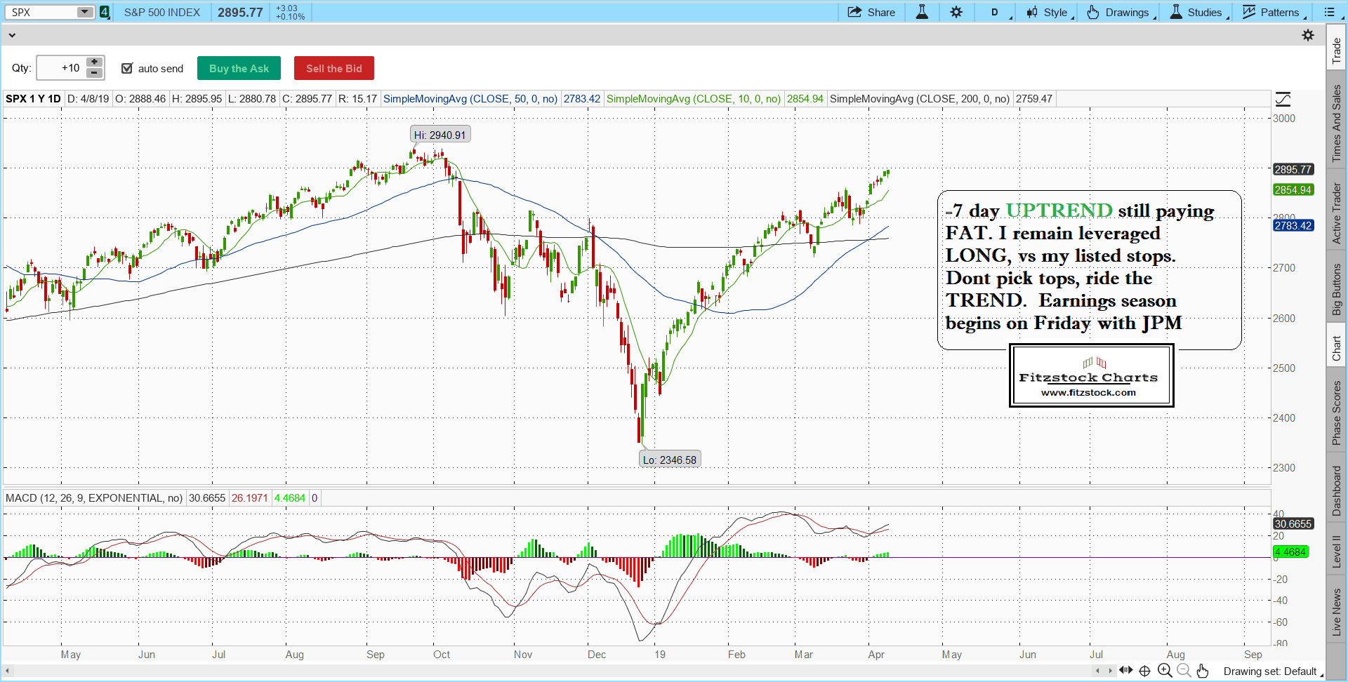 SPX closed in a 7 day UPTREND, with earnings season coming soon. STAY LONG vs stops, and DONT pick tops!