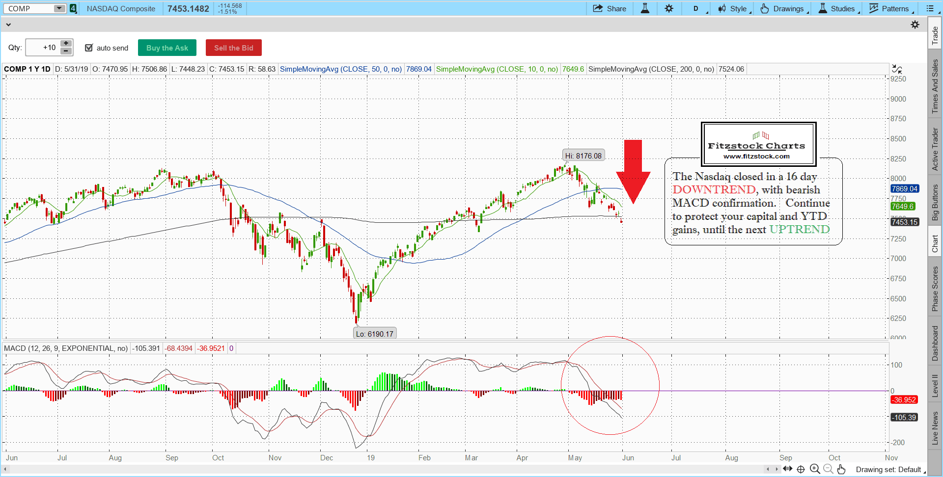 the Nasdaq daily chart close with notes 5/31/19