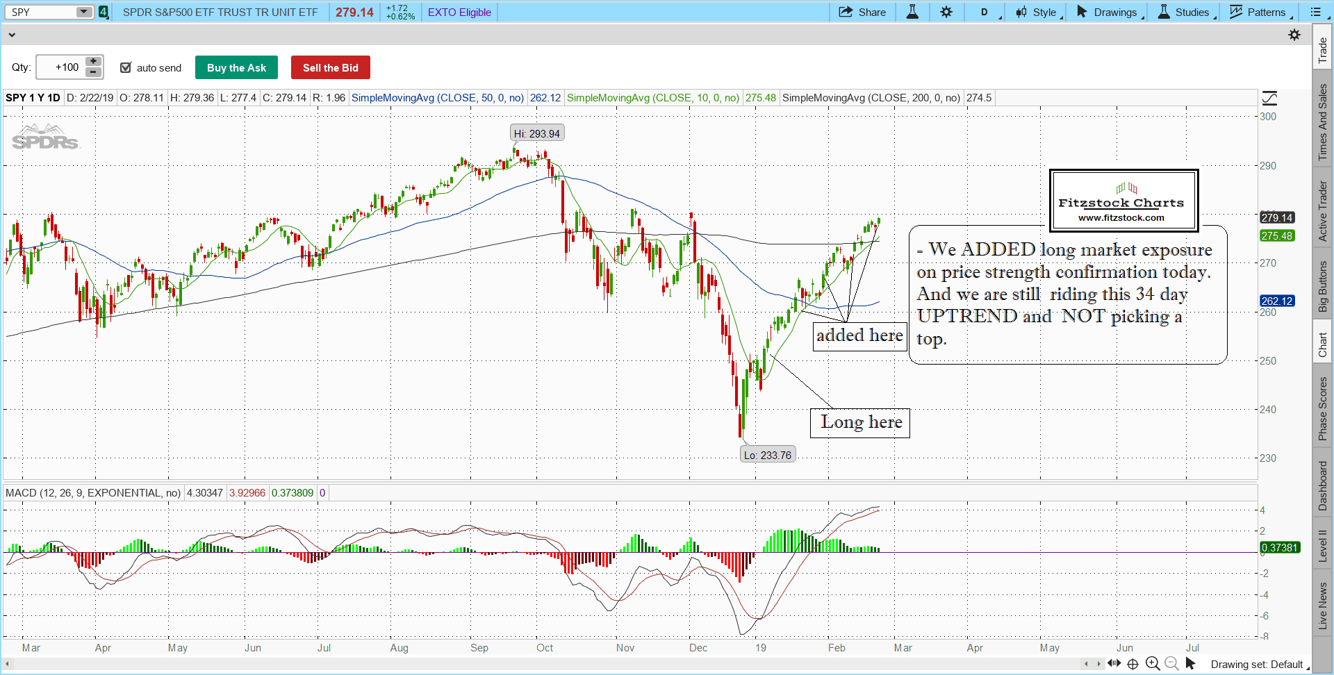 Today we added more Long Market Exposure with price strength confirmation on the SPX. We continue to ride this 34 day UPTREND with stops, while not picking tops.